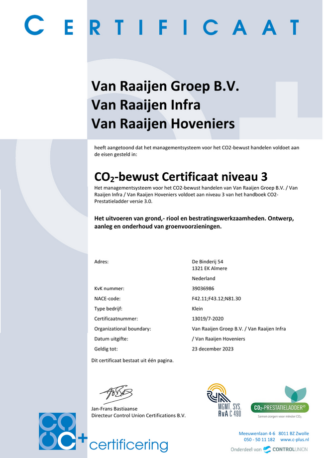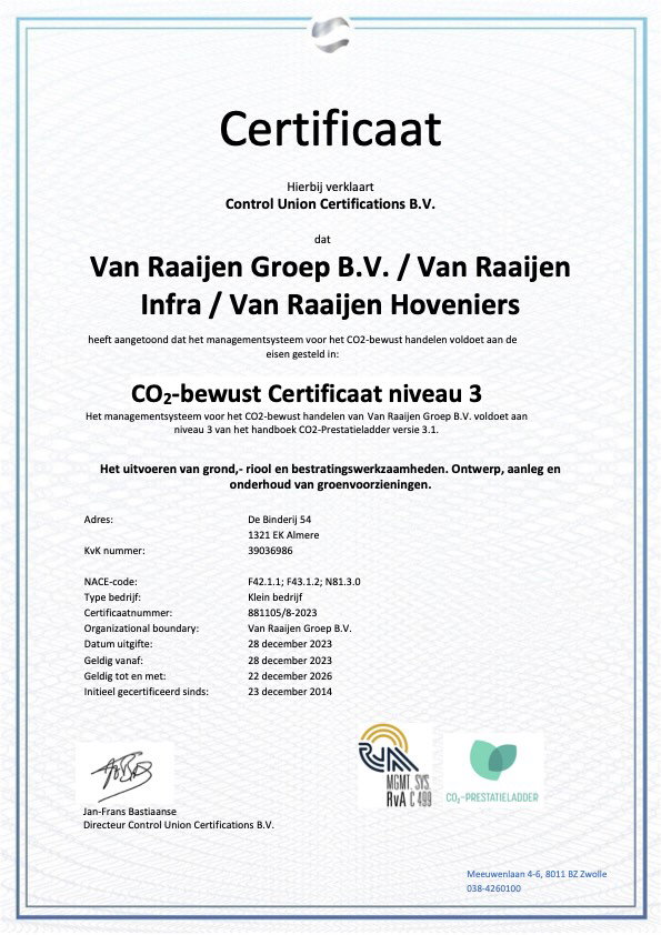 Onze beleidsverklaring met betrekking tot de CO₂ uitstoot is onderdeel van het door ons gevoerde milieubeleid. Als Van Raaijen Groep zetten we onszelf in voor het milieuvriendelijk en duurzaam voorbereiden, organiseren en uitvoeren van alle werkzaamheden en projecten. Dit wil zeggen dat we een actief beleid voeren om milieuvriendelijke noviteiten en innovaties binnen ons bedrijf te implementeren. De uitstoot van CO₂ heeft een overduidelijk negatief effect op het klimaat en daarmee de wereld waarin wij leven. Wij zetten ons dan ook in om de uitstoot van CO₂ zowel binnen onze bedrijven als bij onze leveranciers te verminderen. Op basis van de uitgevoerde emissie inventarisatie is de Carbon Footprint opgesteld. Deze geeft inzicht in de CO₂ uitstoot van de Van Raaijen Groep. De directie van de Van Raaijen Groep heeft aan de hand van de Carbon Footprint een aantal maatregelen vastgesteld die de uitstoot van CO₂ zullen beperken. (informatie over de CO₂ prestatieladder kunt u vinden op de SKAO)