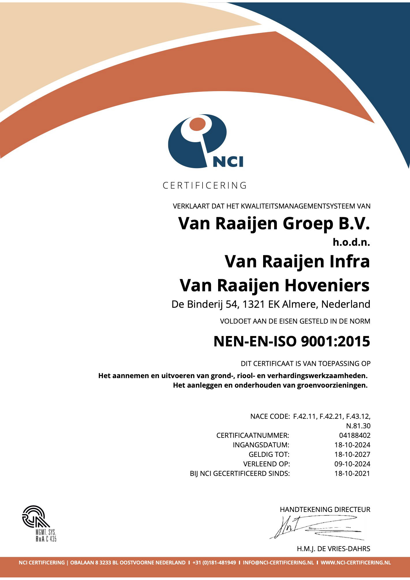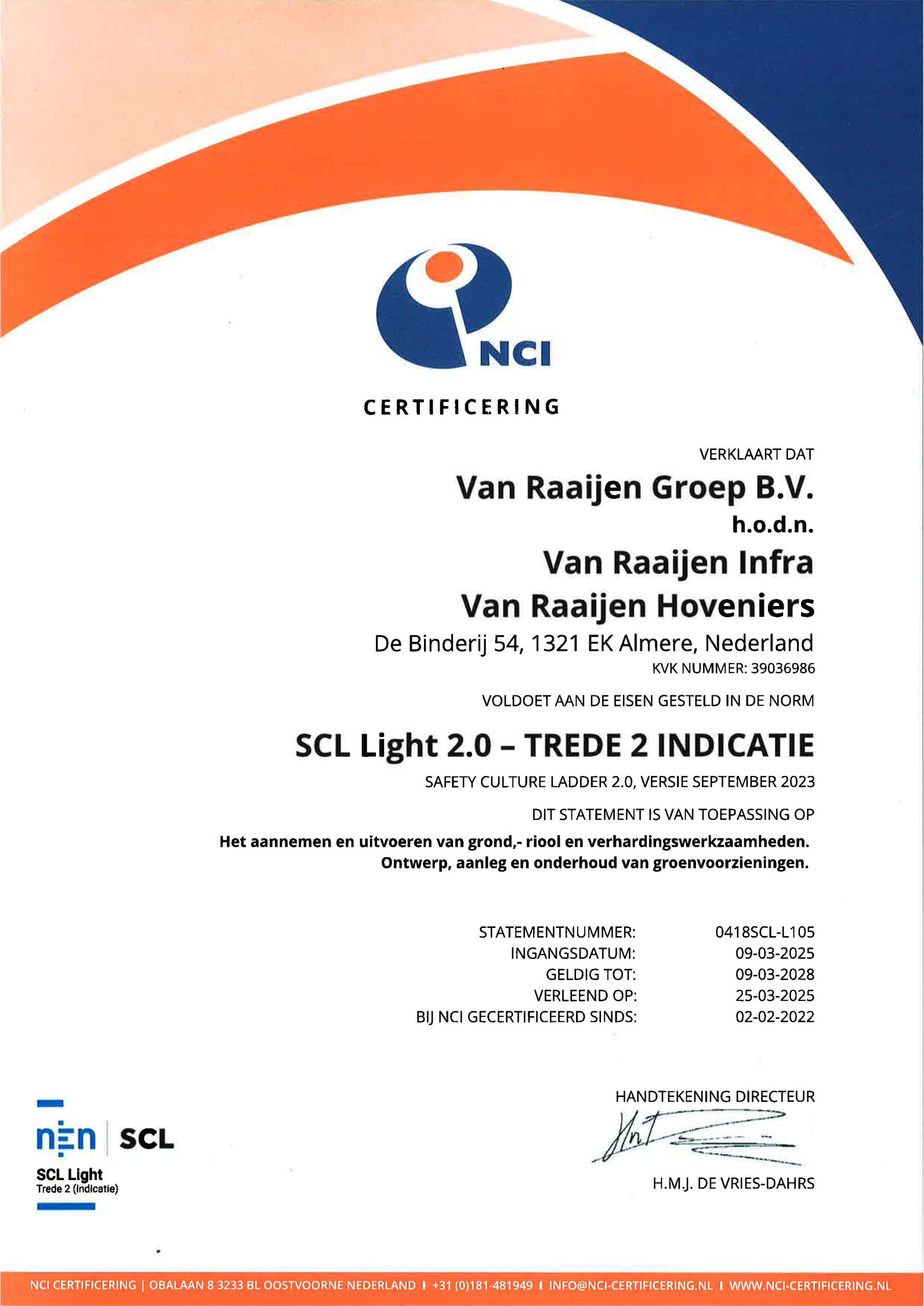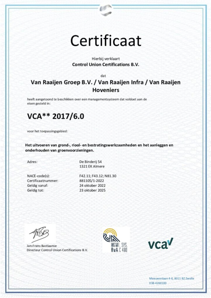 Wij gaan op een bewuste en verantwoorde manier om met mensen, milieu, energie en grondstoffen. We streven naar optimale arbeidsomstandigheden door gezondheids- en veiligheidsrisico’s tot het haalbare minimum te beperken. Hieronder leest u meer over onze certificeringen waarmee we de kwaliteit, veiligheid en duurzaamheid waarborgen. Ook leest u meer over ons duurzaamheidsbeleid.